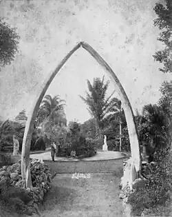 In August 1872, an 84-foot (26 m) long black whale was found stranded on Woody Island in Hervey Bay. It was the largest whale ever seen in the area. Although the original plan was to tow the whale carcass to Maryborough to extract the whale oil, it was decided that extract the oil from the whale at Woody Island and the ship Effie set forth from Maryborough with men and barrels for the job. The boiling-down of the whale yielded 1,500 imperial gallons (6,800 L; 1,800 US gal) of oil. The Queensland Government requested that the skeleton be preserved to be kept as a scientific specimen.[4][5][6] Some of the whale bones were donated to the acclimatization society in January 1887.[7] The jawbones were used to create a archway for the entrance to Bowen Park; it was 22 feet (6.7 m) high.[8][9]