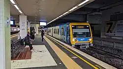 An X'Trapolis train on a Flinders Street-bound service arrives at Platform 2, August 2024