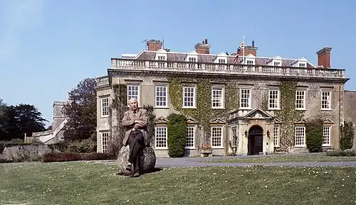 Percy Seymour, 18th Duke of Somerset (1910–1984) in front of his seat, Bradley House; All Saints' Church is visible at left