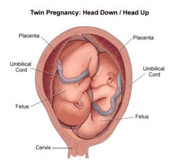 In twin pregnancies, it is very common for one or both babies to be in the breech position. Most often twin babies do not have the chance to turn around because they are born prematurely. If both babies are in the breech position and the mother has gone into labour early, a cesarean section may be the best option. About 30–40% of twin pregnancies result in only one baby being in the breech position. If this is the case, the babies can be born vaginally. After the first baby who is not in the breech position is delivered, the baby who is presented in the breech position may turn itself around, if this does not happen another procedure may performed called the breech extraction. The breech extraction is the procedure that involves the obstetrician grabbing the second twin's feet and pulling him/her into the birth canal. This will help with delivering the second twin vaginally. However, if the second twin is larger than the first, complications with delivering the second twin vaginally may arise and a cesarean section should be offered. At times, the first twin (the twin closest to the birth canal) can be in the breech position with the second twin being in the cephalic position (vertical). When this occurs, risks of complications are higher than normal. In particular, a serious complication is known as Locked twins. This is when both babies interlock their chins during labour. When this happens an urgent cesarean section is recommended.