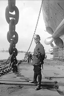 Bremen Police officer standing by an anchor cable at the launching of SS Bremen, 1928