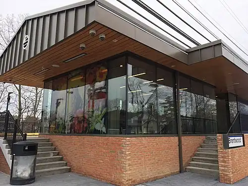 The first station was originally known as Modern Times station and was renamed Brentwood on September 7, 1864. The post office moved here from Thompson's station on January 17, 1870. Inhabitants donated land and money for the depot which was erected in 1870.[3] The depot was burned in April 1903 and was replaced on November 10, 1903. Until 1987, Brentwood station was located on First Avenue between Fourth Street and Brentwood Road. It was moved as part of a major electrification and reconstruction project of the line in Ronkonkoma, Central Islip, Brentwood, Deer Park, and Wyandanch. Originally, the LIRR had planned to merge Deer Park, Pineaire, and Brentwood stations into a single station, but residential opposition blocked that proposal, and only Deer Park and Pineaire were merged. The current station was built close to the former Brentwood station, which was converted into a restaurant shortly after it was abandoned. All grade crossings in the Brentwood area remained unchanged after the station was moved.[4]