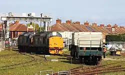 Two Direct Rail Services Class 37 locomotives shunting in the goods yard