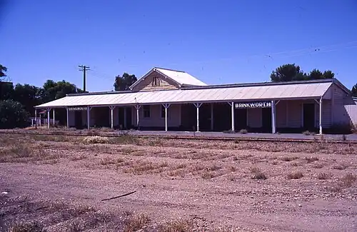 Brinkworth railway station opened when the railway line from Snowtown and the line from Blyth to Gladstone reached it on 2 July 1894. Both lines were originally built as narrow gauge 1,067 mm (3 ft 6 in).[1] Brinkworth was eventually described as “the Great Junction of the Blyth, Snowtown and Gladstone Railways”.[2]