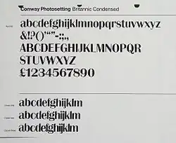 Britannic is a sans-serif typeface family that was sold in metal type by Stephenson Blake. It is a "modulated" or stressed sans-serif design, in which the vertical lines are clearly thicker than the horizontals.[1][2][3] The Klingspor Museum reports that it was originally created by the Wagner & Schmidt foundry of Leipzig, Germany.[4][5] In design it is intended for headings, advertisements and signs rather than continuous body text. Stephenson Blake advertised it as "just the right note for an advertising or display panel".[6]