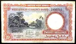 The pound was the currency of British West Africa, a group of British colonies, protectorates and mandate territories. It was equal to one pound sterling and was similarly subdivided into 20 shillings, each of 12 pence.[1] It was issued from 1912 to 1965 by the West African Currency Board.[2]: 166