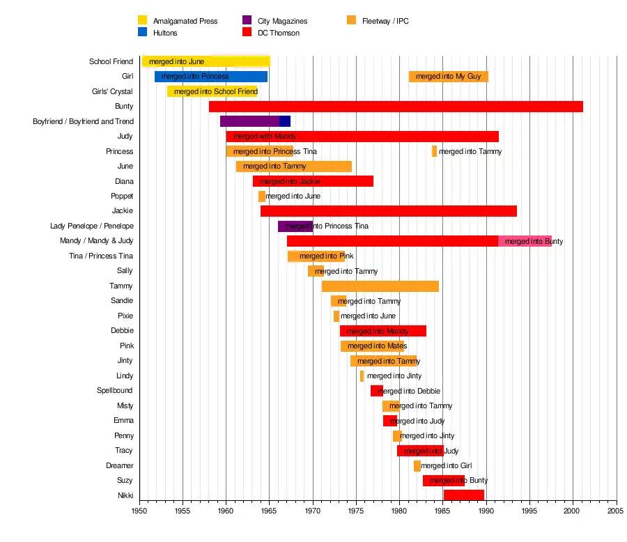 The IPC Fleetway stablemates Tammy (1971–1984), Jinty (1974–1981), and Misty (1978–1980) existed somewhat outside this trend, although in the end both Misty and Jinty ended up absorbed into Tammy[11] (which absorbed four other titles during its run — Sandie, Sally, June, and Princess vol. 2 — before being merged itself with IPC's Girl vol. 2 in 1984).[b]
