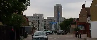 Broadwater Farm, often referred to simply as "The Farm",[1][2] is an area in Tottenham, North London, straddling the River Moselle. The eastern half of the area is dominated by the Broadwater Farm Estate ("BWFE"), an experiment in high-density social housing, loosely based on Corbusian ideas, dominated by concrete towers connected by walkways (the controversial, so-called "Streets in the sky"), built in the late 1960s using cheap but fire-vulnerable pre-fabricated concrete panels. The western half of the area is taken up by Lordship Recreation Ground, one of north London's largest parks. Broadwater Farm in 2011 had a population of 4,844.[3] The estate is owned by Haringey London Borough Council.