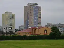 Kenley and Northolt Towers, resurfaced with distinctive colours as part of the regeneration programme, as seen from Lordship Recreation Ground. The Broadwater Farm Community Centre is in the foreground.