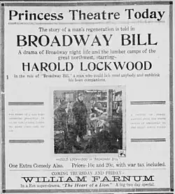 Broadway Bill is a 1918 American silent romantic drama film directed by Fred J. Balshofer and starring Harold Lockwood, May Allison, Pomeroy Cannon, Lester Cuneo, and Fred L. Wilson. The film was released by Metro Pictures on February 11, 1918.[1][2][3]