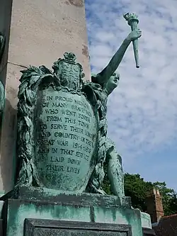 The monument includes a square obelisk constructed of Portland stone, a limestone quarried on the Isle of Portland in the English Channel. It is positioned on a base with three steps. The memorial features three bronze figures adjacent to the lower portion of the obelisk. On the fourth side of the obelisk, the back of the monument, there is a bronze cartouche. In addition, there are bronze plaques with the names of the fallen on all four sides of the base.[6] The statues include a winged Victory in the centre, with a laurel wreath. That statue is flanked by two additional bronze figures, one of Liberty with a torch and the other of Peace with flowers of remembrance.[6] The monument records the names of 769 soldiers from the area who died in World War I. It also lists the names of 476 soldiers and civilians who were killed during World War II.[7][8] The memorial was completed by the sculptor in 1922.[1]