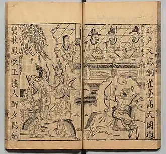 By the Yuan dynasty, a popular tradition took hold viewing Cao Cao as a lustful tyrant and his Bronze Bird Terrace a pleasure palace.[42] The huaben Sanguozhi Pinghua ("Records of the Three Kingdoms in Plain Language") elaborates on the connection Du Mu made between Cao Cao and the Qiao sisters: In the prelude to the Battle of Red Cliffs, Zhuge Liang goads Zhou Yu into war against Cao Cao by stating that Cao Cao is specifically campaigning throughout China in search of beautiful women to fill his Bronze Bird Terrace, and if Zhou Yu fails to act, his own wife—the younger of the Qiao sisters—would be made captive there.[43] Also of note is that the Bronze Bird Terrace was described to be in Chang'an instead of Ye in this story.[44]