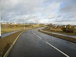 Realigned main road though Broomhouse, with new developments to the south (right) and older housing in Baillieston to the north (left)