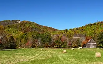 The Brushy Mountains divide, for much of their courses, the waters of the Yadkin River and the Catawba River, two of central North Carolina's largest rivers. The range is approximately 45 miles (72 km) long, but only 4 to 8 miles wide. The highest point in the chain is Pores Knob (2,680 feet, 820 meters), in Wilkes County.[1] Among the other notable peaks in the range are Hibriten Mountain in Caldwell County, which marks the western end of the Brushy Mountains and is a prominent landmark in the city of Lenoir, North Carolina; Hickory Knob, the highest point in Alexander County, North Carolina; Click Mountain (535 m), the highest point in Yadkin County; and Fox Mountain, the highest point in Iredell County, North Carolina. The "Brushies", as they are often called by locals, usually rise from 300 to 800 feet (240 m) above the surrounding countryside, with few peaks rising more than a thousand feet above their base.[1] The forests on the mountains are part of the Southeastern mixed forests ecoregion.[2]