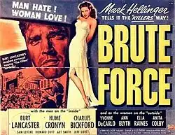 Brute Force (aka Zelle R 17) is a 1947 American crime film noir directed by Jules Dassin, from a screenplay by Richard Brooks with cinematography by William H. Daniels. It stars Burt Lancaster, Hume Cronyn, Charles Bickford and Yvonne De Carlo.[2]