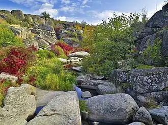 The Bug Gard National Nature Park (Ukrainian: Національний природний парк «Бузький Гард», romanized: 'Buz'kyi Hard') covers an area along the Southern Bug River in south-central Ukraine. At this point, the Southern Bug River cuts through the southern edge of the Ukrainian Shield (a block of Archean basement rock). The national park is therefore a canyon that transitions the river from the upland plateau to the steppe region.[1] The word 'gard' in the name refers to a type of fishing structure used in the Cossack era.[2] The park is spread in sections over Voznesensk and Pervomaisk districts of Mykolaiv Oblast. The major portions are about 140 km upstream from the estuary of the Southern Bug at the Black Sea.