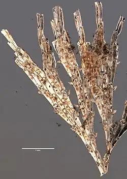 Bugulina flabellata is a colonial bryozoan forming small clumps up to 5 cm (2 in) high with a characteristic cone or fan-shape. The fronds have up to eight dichotomous branches with square tips. Each zooid bears two or three short spines. Colonies are dark buff when living and greyish when dried up.[2]