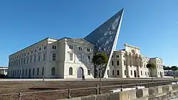 Before opening in October 2011 as the Bundeswehr Military History Museum, the building underwent six years of extensive construction. Jewish architect Daniel Libeskind added a transparent arrowhead to the façade of the building, creating, according to the Dresden Tourism board, "an outwardly visible expression of innovation".[4] This new element is also reflected in the logo of the museum. Libeskind's studio states that "the openness and transparency of the new façade, representing the openness of democratic society, contrasts with the rigidity of the existing building, which represents the severity of the authoritarian past".[2] The silver arrowhead protrudes from the center of the traditional Neo-Classical building and provides a five-story, 29 meter high viewing platform which overlooks the city.[3] The platform provides views of modern Dresden while pointing towards the area where the fire bombings of Dresden began. The redesigned Dresden Museum of Military history has become the main museum of the German Armed Forces. The building itself is 14,000 square meters and has an inside and outside exhibition area of about 20,000 square meters, making it Germany's largest museum.[2] In every aspect, the museum is designed to alter the public's perception of war.