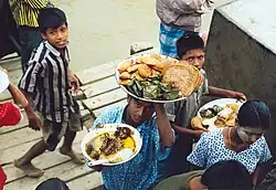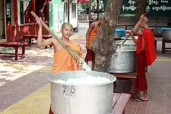 While record-keeping of pre-colonial culinary traditions is scant, food was and remains deeply intertwined with religious life, especially among Buddhist communities, exemplified in the giving of food alms (dāna), and communal feasts called satuditha and ahlu pwe (အလှူပွဲ). One of the few remaining pre-colonial cookbooks is the Sadawhset Kyan (စားတော်ဆက်ကျမ်း, lit. 'Treatise on Royal Foods'), written on a palm leaf manuscript in 1866 during the Konbaung dynasty.[10] By the Konbaung dynasty (16th to 19th centuries), elaborate preparations of food played a central role in key court ceremonies (e.g., naming ceremonies, wedding ceremonies, etc.), including as ritual offerings to Hindu and indigenous deities, and as celebratory meals for attendees.[11] By the Konbaung period, 126 distinct varieties of rice were cultivated in the country.[12]