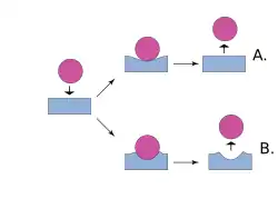 Dragging the ball across the plate will have a different effect than pressing. In that case, the force on the ball can be decomposed into two component forces: one normal to the plate's surface, pressing it in, and the other tangential, dragging it along. As the tangential component is increased, the ball will start to slide along the plate. At the same time, the normal force will deform both objects, just as with the static situation. If the normal force is low, the ball will rub against the plate but not permanently alter its surface. The rubbing action will create friction and heat, but it will not leave a mark on the plate. However, as the normal force increases, eventually the stresses in the plate's surface will exceed its yield strength. When that happens the ball will plow through the surface and create a trough behind it. The plowing action of the ball is burnishing. Burnishing also occurs when the ball can rotate, as would happen in the above scenario if another flat plate was brought down from above to induce downwards loading, and at the same time to cause rotation and translation of the ball, as in the case of a ball bearing.
