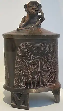 Tripod vessel with lid, Maya culture, Mexico or Guatemala, c. 4th-5th century, hand-built ceramic with incised decoration and burnished slip, Honolulu Museum of Art, accession 4183.1