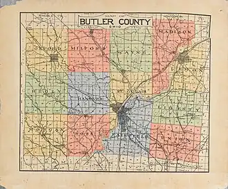 Butler County was formed on March 24, 1803, from portions of Hamilton County. It is named for General Richard Butler.[7] Between 1803 and 1823, the townships of the county became officially recognized.[6] Large portions of the county were held by non-resident owners, including 640 acres owned by future President William H Harrison.[6] Some land that was originally part of Butler County was reassigned to Warren County in the north and Hamilton County to the south. Butler County's original size was 480 sq miles.[6]