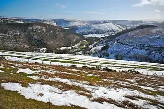 The Horseshoe Pass (Welsh: Bwlch yr Oernant, "Pass of the Cold Stream") is a mountain pass in Denbighshire, north-east Wales. It separates Llantysilio Mountain to the west from the 565 metre (1,854 feet) mountain and Marilyn Cyrn-y-Brain to the east. The A542 road from Llandegla to Llangollen runs through the pass, reaching a maximum height of 417 metres (1,368 ft). The road travels in a horseshoe shape around the sides of a valley, giving the pass its English name. In 2022, a proposal for a 40 mph speed limit on the Horseshoe Pass was approved after a lengthy campaign by Llangollen's county councillors.[1]