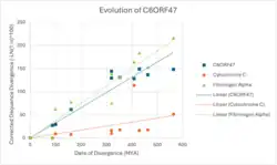 C6ORF47 gene is estimated to have first appeared approximately 563 million years ago (MYA) in lampreys. C6ORF47 was found in ray-fined fish (actinopterygii), cartilaginous fish, lampreys, and lobe-finned fish (sacropterygii), but no hagfish suggesting that possibly this gene was inserted into lampreys. C6ORF47 is conserved to vertebrates with no traces of it being present before vertebrates as seen by its oldest ancestor lampreys (563 MYA). The C6ORF47 gene evolved quite rapid since it was shown to evolve slightly slower than Fibrinogen Alpha and it much faster than Cytochrome C. Orthologs used for this diagram included Human, House Mouse, African Bush Elephant, Koala , Painted Turtle, Eastern Brown Snake, Iberian ribbed newt, West African Lungfish, Danio rerio, Seven-gill Sharpnose Shark, and Sea Lamprey) (See Time-Calibrated comparative date of divergence diagram located to the down to the right).