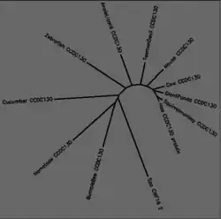 Coiled-coil domain containing 130 is a protein that in humans is encoded by the CCDC130 gene. It is part of the U4/U5/U6 tri-snRNP in the U5 portion. This tri-snRNP comes together with other proteins to form complex B of the mature spliceosome. The mature protein is approximately 45 kilodaltons (kDa) and is extremely hydrophilic due to the abnormally high number of charged and polar amino acids.[5] CCDC130 is a highly conserved protein, it has orthologous genes in some yeasts and plants that were found using nucleotide and protein versions of the basic local alignment search tool (BLAST) from the National Center for Biotechnology Information.[6] GEO profiles for CCDC130 have shown that this protein is ubiquitously expressed, but the highest levels of expression are found in T-lymphocytes.[6]