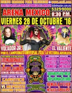 The CMLL Día de Muertos (2016) (Spanish for "Day of the Dead") is a professional wrestling supercard event, scripted and produced by the Mexican Lucha Libre promotion Consejo Mundial de Lucha Libre (CMLL). The show took place on October 28, 2016 in CMLL's main venue, Arena México, in Mexico City, Mexico and celebrated the Mexican Day of the Dead celebration. Many of the wrestlers working the show wore the traditional Día de Muertos face and body paint for the Día de Muerto event. From the fourth match on the losing wrestlers were dragged to El Inframundo ("The Underworld"), a side entrance in the arena, by a group of wrestlers dressed up as minions of the ruler of the underworld.[2][1]