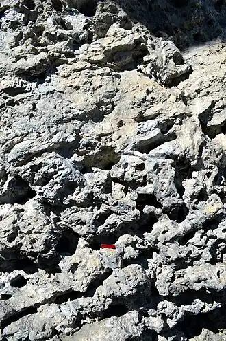 Bulbous stromatoporoids are particularly common in the Cairn Formation and were the main reef-building organism.[7] There are also tabular stromatoporoids, Amphipora, horn corals, tabulate corals such as Thamnopora, brachiopods, crinoids, algae and foraminifera.[5][8] The organisms are commonly either in growth position or have only been moved short distances. Some stromatoporoids show evidence of bioerosion by boring sponges.[4]