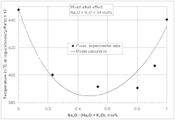 Schott and many scientists and engineers afterwards applied the additivity principle to experimental data measured in their own laboratory within sufficiently narrow composition ranges (local glass models). This is most convenient because disagreements between laboratories and non-linear glass component interactions do not need to be considered. In the course of several decades of systematic glass research thousands of glass compositions were studied, resulting in millions of published glass properties, collected in glass databases. This huge pool of experimental data was not investigated as a whole, until Bottinga,[13] Kucuk,[14] Priven,[15] Choudhary,[16] Mazurin,[17] and Fluegel[18][19] published their global glass models, using various approaches. In contrast to the models by Schott the global models consider many independent data sources, making the model estimates more reliable. In addition, global models can reveal and quantify non-additive influences of certain glass component combinations on the properties, such as the mixed-alkali effect as seen in the adjacent diagram, or the boron anomaly. Global models also reflect interesting developments of glass property measurement accuracy, e.g., a decreasing accuracy of experimental data in modern scientific literature for some glass properties, shown in the diagram. They can be used for accreditation of new data, experimental procedures, and measurement institutions (glass laboratories). In the following sections (except melting enthalpy) empirical modeling techniques are presented, which seem to be a successful way for handling huge amounts of experimental data. The resulting models are applied in contemporary engineering and research for the calculation of glass properties.