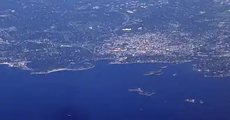 Calf Island (highest of the three large islands in bottom right) as seen facing Port Chester, New York