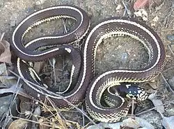 The California kingsnake is cathemeral; it may be active day or night depending on ambient temperatures.[6][12] When disturbed, California kingsnakes often coil their bodies into a ball[13] to hide their heads, hiss, and rattle their tails, which can produce a sound somewhat resembling that of a rattlesnake. When they are nervous they tend to twitch their tails.[14] They are considered harmless to humans, but if handled it is common for this species to bite, as well as to excrete musk and fecal contents from their cloaca.[15] It is also common for this musky odor to be excreted when the snake feels threatened.[6] California kingsnakes are considered to be generally solitary, but when mating season or brumation is in process, they group together.[16]