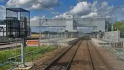 The facilities comprise a 450-square-metre (4,800 sq ft) station building comprising a passenger waiting area, toilets, ticket office, retail and amenity space, and staff accommodation.[45] An overbridge links the building with two 254-metre (833 ft) platforms capable of accommodating 12-car trains.[41] The easternmost platform faces the up line of the Fen Line, while the second platform is an island platform with the down Fen Line on one side and a south-facing bay platform on the other.[41] Two relaid freight lines for Lafarge run next to the bay platform.[41]
