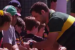 Smith was selected to play for the Australian national team at hooker the 2007 ANZAC Test match victory against New Zealand.[18] For the 2007 State of Origin series, Smith took out both the Wally Lewis Medal for player of the series and Ron Mcauliffe Medal for Queensland player of the series.[19] He was also named the Melbourne Storm player of the year. Smith captained the Melbourne Storm in their 34–8 victory over the Manly-Warringah Sea Eagles in the 2007 NRL Grand Final.