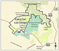 Camp San Luis Obispo, formerly called Camp Merriam, was established in 1928 and is called the original home of the California National Guard. The camp is in San Luis Obispo County, which is on the Central Coast of California. State Route 1 passes through the camp about halfway between the cities of Morro Bay and San Luis Obispo. Since World War II, the camp has had an area of 15,433 acres (62 km2).[2] The camp originally comprised 6,274 acres (25 km2), and a further 9,159 acres (37 km2) was acquired during 1941. During World War II, the camp had quarters for 1,523 officers and 19,383 enlisted personnel.[2]