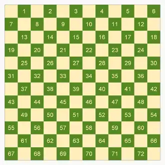 Canadian checkers follows the same rules and conventions as international draughts, the only differences are the larger gameboard (12×12 squares instead of 10×10), and more checkers per player (30 instead of 20). The starting setup is shown in the diagram.