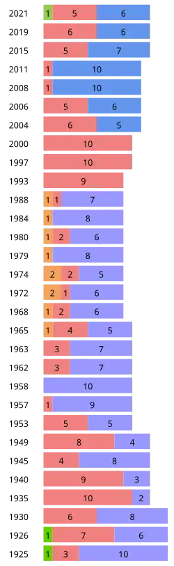 Before the late 1950s, Midwestern Ontario had not leaned towards either the Progressive Conservatives (PCs or Tories) or the Liberals (Grits) on a regular basis as there was wide variation in each party's results from election to election. Since the late 1950s, however, it has been a primarily conservative-voting area. Even when the Liberals won every federal election except one from 1963 to 1980 inclusive, the PCs usually won the majority of seats in this region, and in the 1979 Progressive Conservative election plurality, the only seat the Tories did not win was won by the New Democrats (NDP). The NDP usually claimed one seat from the mid-1960s until the 1993 election, usually in the riding of Brant.