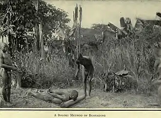 Prisoner about to be beheaded among the Boloki near the Ruki River. In this area, captured enemies were usually ransomed, sold into slavery, or else killed and eaten.[117]