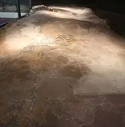 Generations of building at Canterbury have raised the level of the town since Roman times so that the pavement, with preserved remains of a town house with hypocaust, is exhibited in situ underground.[4][11] The scheduled monument listing describes the pavement thus: "The excavations of 1945−1946 uncovered a series of three mosaic panels which decorate the remains of a corridor of a Roman house".[7] It dates from around 300 AD and is preserved with an air conditioning system.