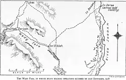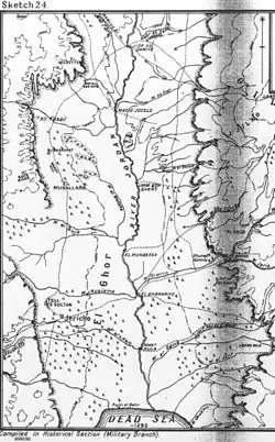 Chaytor's Force held the right flank from their junction with the XX Corps in the Judean Hills 8 miles (13 km) north west of Jericho, across the Jordan Valley, and then southwards through the Ghoraniye and Auja bridgeheads to the Dead Sea.[8] This area garrisoned by Chaytor's Force was overlooked by well sighted Ottoman long range guns.[9]