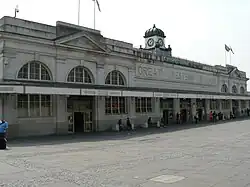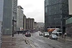 Queen Street (Welsh: Heol y Frenhines) is the main thoroughfare in the city, now wholly pedestrianised. Most of Queen Street, from the castle moat to Dumfries Place, used to be called Crockherbtown (Crockherbtown Lane can still be found off Park Place),[8] but the street was renamed in honour of Queen Victoria in 1886.[9] Queen Street was pedestrianised in 1974 and is served by Cardiff Queen Street railway station on Station Terrace. It meets Dumfries Place/Newport Road at its eastern end, Duke Street/Castle Street at its western, and Park Place approximately halfway along. Further down Park Place is the New Theatre, a local landmark is Principality House, head office of the Principality Building Society.[10] To the north running parallel is Greyfriars Road, referring to the site of an old monastery, a traditional office location that has recently seen conversion to bars, apartments and hotels as offices move to the new business parks on the edge of the city, or to the better connected southern end of the city centre.