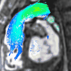 Conventional phase contrast imaging can be extended by applying flow-sensitive gradients in 3 orthogonal planes within a 3D volume throughout the cardiac cycle. Such 4D imaging encodes the velocity of flowing blood at each voxel in the volume enabling fluid dynamics to be visualised using specialist software. Applications are in complex congenital heart disease and for research into cardiovascular flow characteristics - however it is not in routine clinical use due to the complexity of post-processing and relatively long acquisition times.[26]