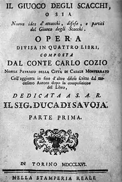 In 1740 he completed the manuscript of Il Giuoco degli Scacchi o sia Nuova idea di attacchi, difese e partiti del Giuoco degli Scacchi, which was published in 1766 in Turin by the Stamperia Reale as two volumes amounting together to 700 pages. He is also known for Cozio's mate.