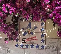 A panel of azulejos celebrating CAISL's 50th anniversary with an image of the old crest of St. Columban's School superimposed in front of CAISL's current emblem.