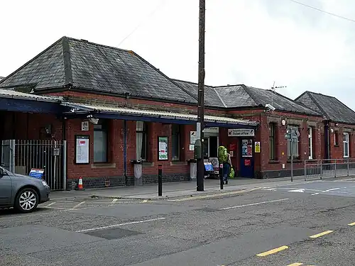 Carmarthen railway station is a stop on the West Wales Line, serving the town of Carmarthen, Wales. It is sited south of the River Towy, 245 miles 55 chains (395.4 km) from London Paddington, on the route via Stroud.[1] The station is operated by Transport for Wales, which operates the majority of services; Great Western Railway also runs a limited service to London Paddington.
