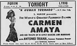 - ^ The pronunciation of Amaya and Amalla in Spanish is essentially the same. There are also later documents such as event posters and photos, in which Carmen Amaya's family name is spelled Amalla, see e.g. Madridejos, Montse; Pérez Merinero, David (2013). Carmen Amaya. Barcelona: Ediciones Bellaterra. pp. 47, 49. ISBN 978-84-96210-71-4.
