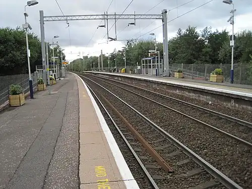 Carntyne railway station serves the Carntyne area of Glasgow, Scotland. The station is 2¾ miles (4 km) east of Glasgow Queen Street railway station on the North Clyde Line. The station is managed by ScotRail. The ticket office, constructed when the line was electrified by British Railways in 1960, was cleared away in the early 1990s leaving Carntyne station unstaffed and with only basic 'bus stop'-style shelters on the platforms for passengers to use.