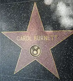 Burnett worked as an usherette at the Warner Brothers Theater (now the Hollywood Pacific Theatre). When the cinema screened Alfred Hitchcock's Strangers on a Train (1951), having already seen and enjoyed the film, she advised two patrons arriving during the last five minutes of a showing to wait until the beginning of the next showing to avoid spoiling the ending for them, but the couple insisted on being seated. The manager observed Burnett not letting the couple in and fired her, stripping the epaulettes from her uniform on the spot.[23] Years later in the 1970s after achieving TV stardom, when the Hollywood Chamber of Commerce offered her a star on the Hollywood Walk of Fame, they asked her where she wanted it. She replied "Right in front of where the old Warner Brothers Theater was, at Hollywood and Wilcox", which is where it was placed,[13][24] at 6439 Hollywood Blvd.[25]